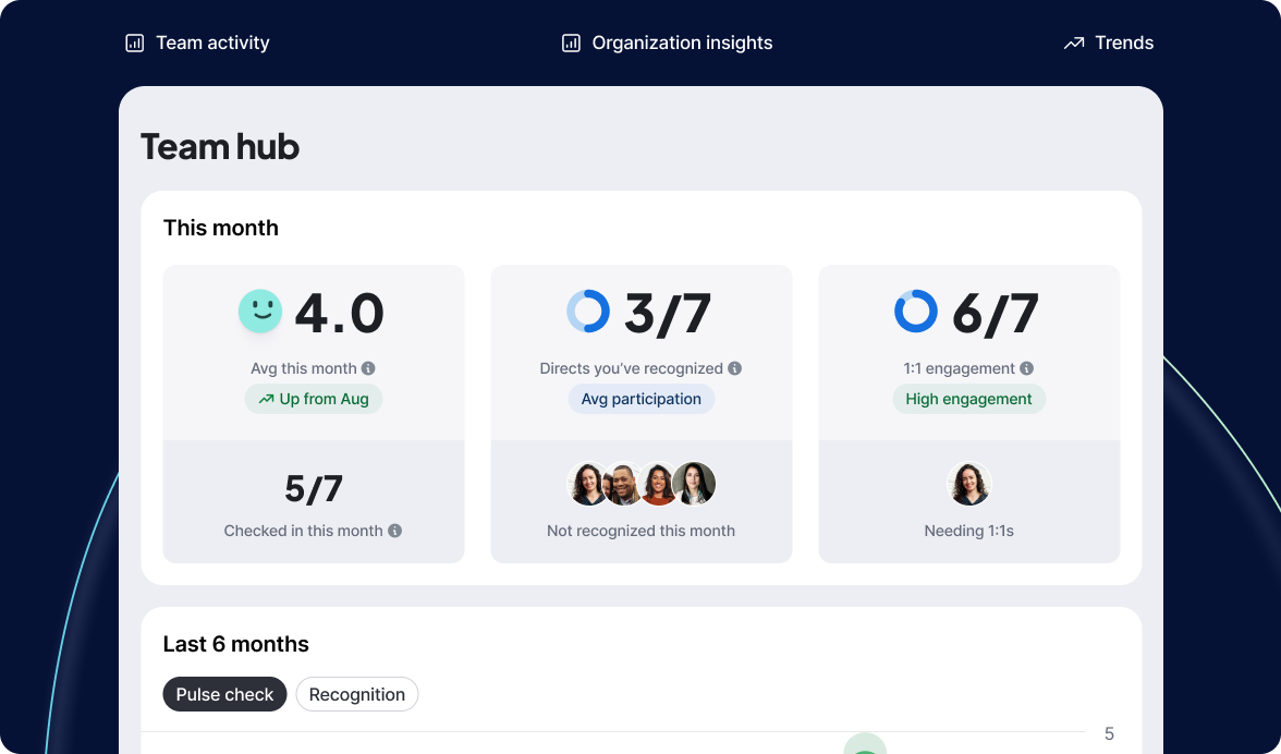 Bring collaboration, recognition, and insights into one place. Spot what’s going well, notice where someone might need support, and know when and how to step in.