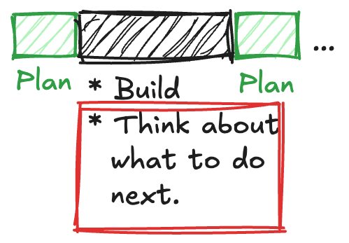 Thinking about what to do next is our bottleneck. (And I accordingly put a bright, red square around it to reinforce the point.) The builders finish building much faster than they used to, which means the planners need to plan faster so we can keep the builders building.