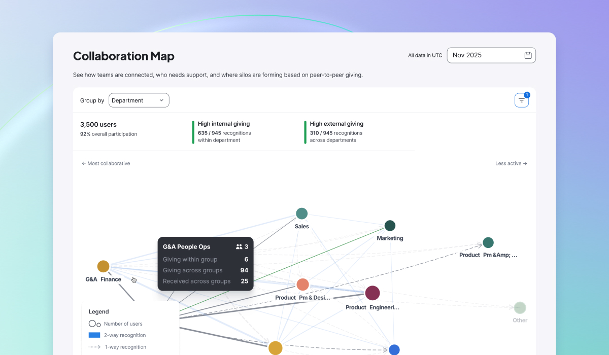 With peer recognition, anyone can spotlight contributions. Smart prompts help people write recognition that’s specific and genuine, strengthening relationships while capturing insight into how teams actually collaborate.