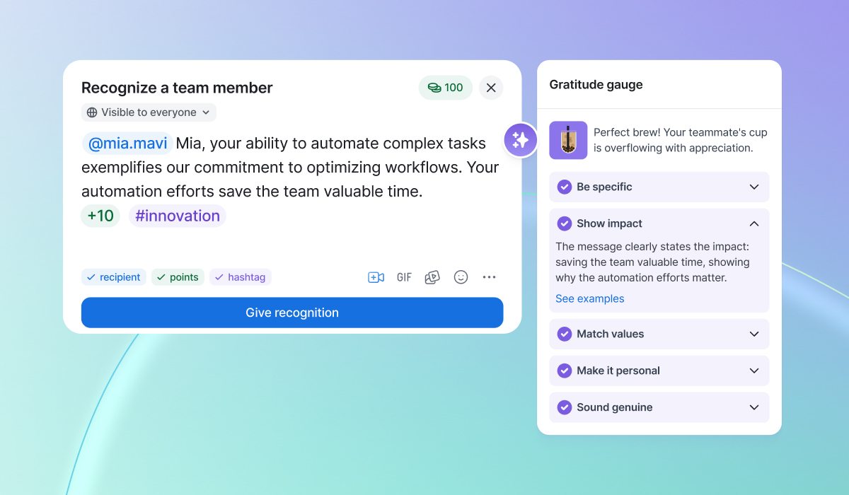 Recognition Quality Scores show how specific, values-based, and personalized your recognition data is. The more quality the recognition, the more insights leaders get into things like which values show up in daily work, which skills drive results, and how individual contributions connect to company goals.